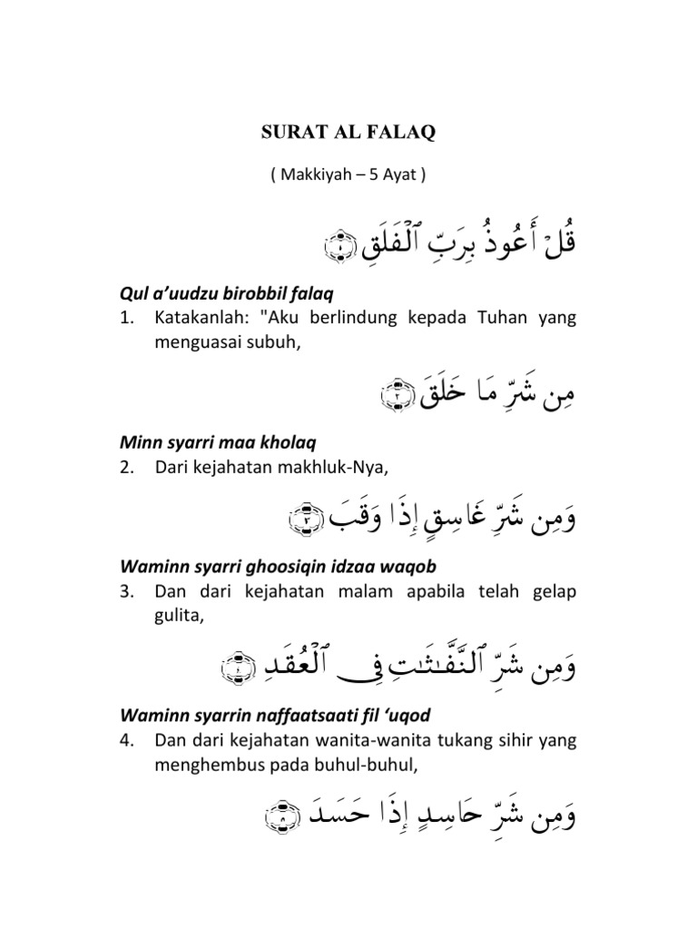 Surah al falaq diturunkan di kota mekkah maka digolongan surah makkiyah dan diturunkan sesudah surat al fil. Sebab kitab al quran diawali dengan surat al faatihah. Bacaan surah al falaq arab, latin dan terjemahan bahasa indonesia. Surat ini tergolong surah makkiyah. Surat al falaq dan surat an nas juga disebut al muqasyqisyatain.