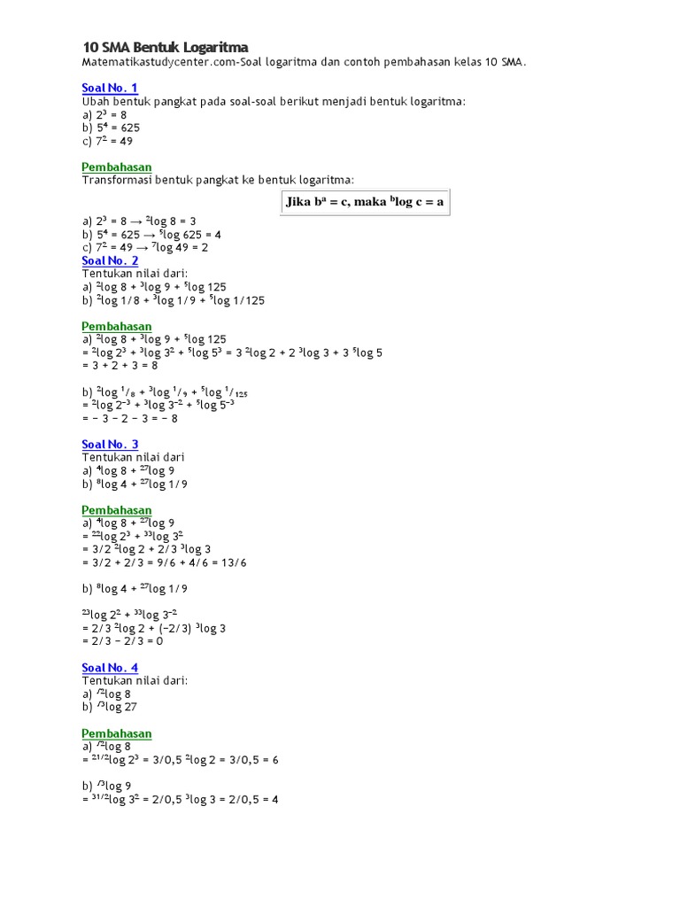 Contoh Soal Persamaan Logaritma Dan Pembahasannya - Kunci ... from imgv2-1-f.scribdassets.com Seperti yang diketahui, logaritma adalah invers dari perpangkatan. Rumus dasar logaritma digunakan untuk mempermudah kita menyelesaikan masalah terkait logaritma. Di dalam matematika, akar kuadrat dari bilangan x sama. Pada akhir pembahasan juga dilampirkan tabel rumus. Makalah materi download unduh contoh soal limit matematika beserta pembahasan dan jawabannya lengkap terbaru beserta pembahasan tentang pengertian limit. Ada contoh soal latihan logaritma yang bisa kamu kerjakan di sini. Buat kalian yang ingin lebih jauh belajar mengenai materi ini bolehlah mengerjakan. Soal no.13 (snmptn 2008 dasar) dalam bentuk pangkat rasional.